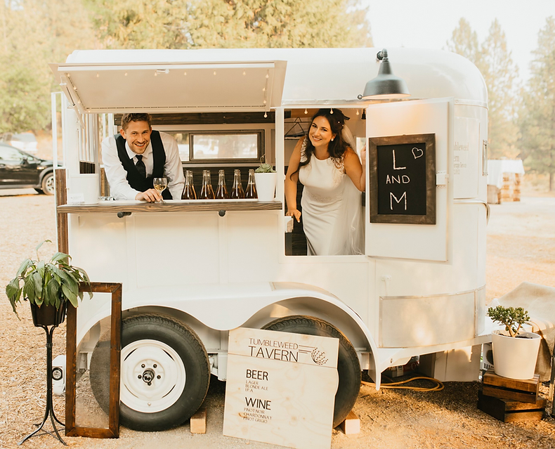 The Tumbleweed Tavern was such a wonderful addition to our wedding day. The beverage trailer provided our guests with a charming bar experience and the set-up and take-away was completely handled by the Tumbleweed staff, allowing my spouse and I to focus our time with our guests. I can’t recommend the Tumbleweed Tavern enough to any couples looking for a unique bar experience, that is easily placed within your chosen venue space. Our guests still ask us about the Tavern today, it was a total hit! “ Thank you again, this is such a great idea and know other couples will enjoy it as well!